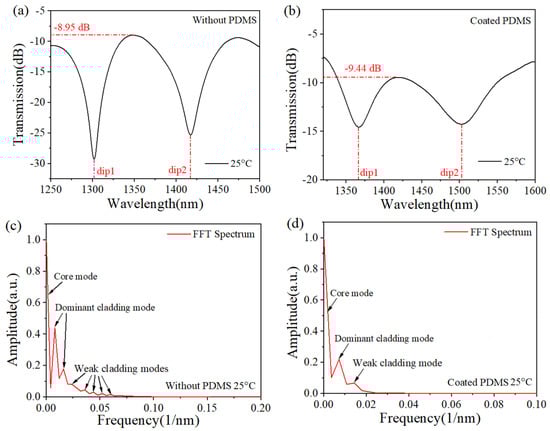 Transmission spectrum (a) without PDMS and (b) with PDMS at 25 °C; fast Fourier transform (FFT) spectrum (c) without PDMS and (d) with PDMS at 25 °C.