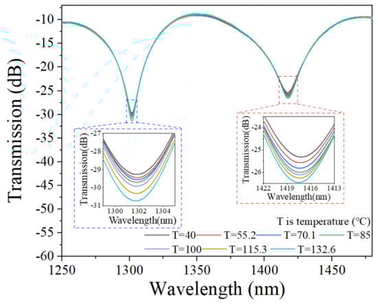 The temperature-sensing characteristics of the bare MTSM were then investigated. The transmitted spectra of the bare MTSM structure without PDMS coating at different temperatures are shown in Figure 6. When the external temperature increases, the resonant dips have almost no change and the contrast depth is less than 2 dB. It can be seen from the spectral curves that the bare MTSM structure without PDMS coating is almost insensitive to changes in temperature due to the low TOC of quartz silica.