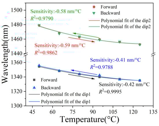 In the repeatability experiment, the temperature in the CEC gradually increased from 50 °C to 125 °C and then progressively reduced to 50 °C. The temperature repeatability of the sensor is shown in Figure 8. It is observed that the intersection of internal envelopes exhibits a polynomial shift in response to temperature variations, and the temperature sensitivities were approximately the same during the temperature increase and decrease (R2 > 0.9788).