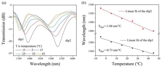 (a) Transmission spectral evolution of the PDMS-coated MTSM in the range of −5~45 °C; (b) resonant dips wavelength shifts versus temperatures.