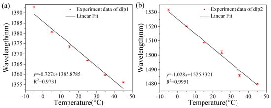 In order to show the good repeatability of the sensor more intuitively, the repeated data in Figure 10a,b were linearly fitted. According to the repeated experimental results of temperature sensing, it can be seen that in three repeated experiments, the error bars at maximum dip1 and dip2 are 0.529 nm and 0.945 nm, respectively. The errors of data collection points are relatively small. Therefore, it can be concluded that the prepared sensor has excellent sensitivity and good performance repeatability.