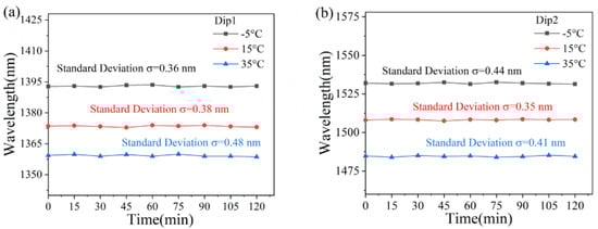 The wavelength changes of the three dips were recorded nine times at −5 °C, 15 °C, and 35 °C every 15 min. As illustrated in Figure 11, the experimental findings emphasize the sensor’s remarkable temperature stability. Figure 11a,b effectively showcase the stable behavior of dip1 and dip2. During the 0 to 120-min interval, the interferometric spectra show subtle variations that can be attributed to minor equipment deviations. Notably, the standard deviations at each temperature measurement stay reliably below 0.48 nm, falling well within the permissible fluctuation limits. This level of temperature stability is a clear indicator of the sensor’s superior performance and dependability.