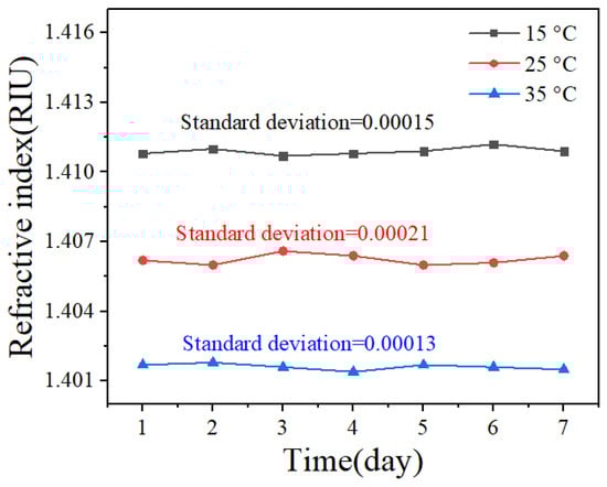 The stability of the polydimethylsiloxane refractive index was evaluated at temperatures of 15 °C, 25 °C, and 35 °C. The testing period lasted 7 days, during which data were recorded at 4-h intervals and daily averages were subsequently calculated. The maximum standard deviation is 0.00021 RIU, as shown in Figure 12.