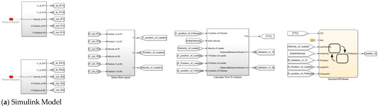 According to the above modelling framework, the vehicle-following model is demonstrated in Figure 2. In this model, the leader and the follower vehicles are connected together via V2V communications. The functions of the follower vehicle include data reading from all sensors employed in the vehicle (i.e., GPS, velocity sensor, radar, camera, etc.), data receiving, time-to-collision (TTC) calculations (i.e., the ratio of the distance between vehicles and the difference in velocities between vehicles, as further described in Appendix A), velocity decision control, path-following control, and vehicle dynamics, respectively. This vehicle-following model was designed and implemented in MATLAB/Simulink, and more details can be found in [17].