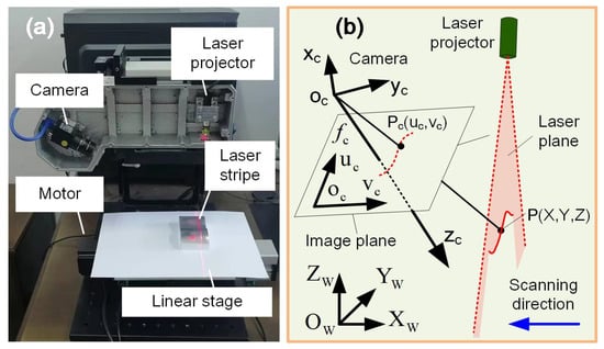 The measurement principle is illustrated in Figure 1b. OWXWYWZW and ocxcyczc are the world and the camera coordinate systems, respectively. ocucvc is the pixel coordinate system with ocuc//ocxc, ocvc//ocyc. ocxc is the optical axis, and fc is the focal length of the lens. OWXWYWZW is positioned on the top surface of the linear stage with the OWXW axis aligned with the scanning direction. This would make the surface reconstruction more convenient. Here, we mainly focus on the adaptive control of the LSLMS.