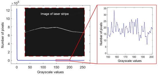 Figure 2 shows a stripe image and its corresponding histogram curve. Unlike the common visual inspection images, it can be seen that only the pixels within the stripe area are highlighted. These pixels account for only a minuscule proportion of the entire image, while the majority of pixels have a grayscale value of 0. For our camera, it has 1280 × 1024 pixels. During the measurement process, the number of pixels with a grayscale value of 0 can reach up to 1.2 × 106. The number of pixels with other grayscale values is extremely small, resulting in an “L” shape in the histogram curve. In this scenario, the variation in this curve is hardly visible when the camera exposure time is changed. Therefore, this histogram curve cannot be directly utilized for adaptive control.