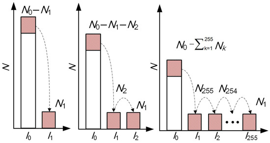 The total number of pixels, N0, does not change along with the exposure time. Assume that the camera exposure time increases uniformly by λ times, and the number of migrated pixels is Nk. The number of pixels corresponding to each gray value is logarithmically processed and then summed as