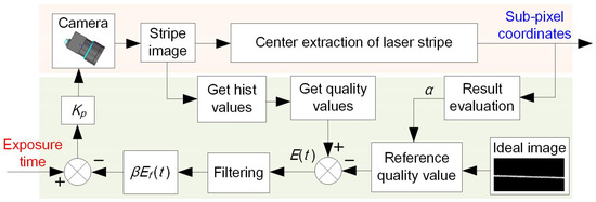 The block diagram of the adaptive control system is shown in Figure 4. When adaptive control is not applied, the measurement process is typically accomplished through the following steps: capturing the stripe images, extracting the stripe center points, and computing the measurement profile according to the camera’s intrinsic parameters and the equation of laser plane. The exposure time of the camera is fixed for the entire scanning process. Nevertheless, the surface characteristics of the object may change during the measurement process, which makes it difficult to ensure the quality of the laser stripe.