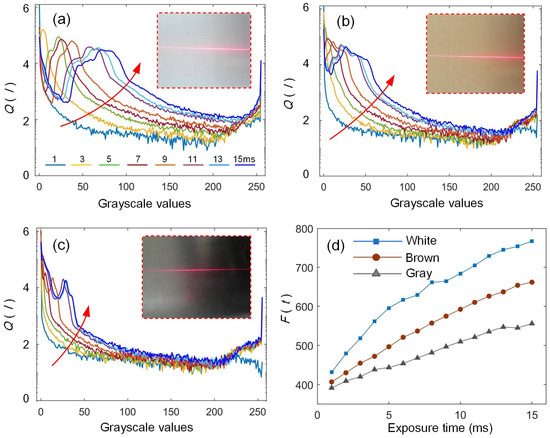 To analyze the influence of exposure time on the quality values of laser stripe, objects with different materials and colors are selected to obtain the logarithmic curves under different exposure times, as shown in Figure 5a–c. For these cases, it can be seen that the number of large gray pixels increases with the exposure time. The gray logarithmic curves move upwards and the area under the curve becomes larger. Thus, the value of image quality F(t) also increases. The lighter the color of the measured surface, the more significant the upward shift in the curves, and higher-quality values can be obtained by integration. The logarithmic curve reaches its maximum value at zero, which indicates that the gray values of most pixels are zero under normal circumstances. The stripe images are processed using a computer with an Intel i5-3470 CPU and 4GB RAM. The computation time for each stripe quality value is 1.8ms, which has been reduced effectively compared with the width computation method [30].
