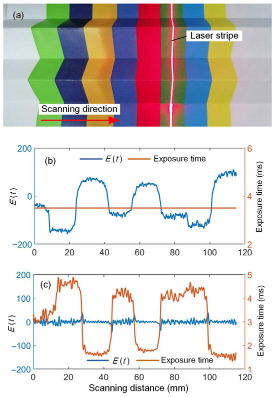 To validate the effectiveness of the adaptive control method, color stripes are printed on a piece of paper, and it is then folded into an “M” shape, as shown in Figure 6a. The laser line is carefully adjusted to align with the stripes, and the scanning direction is perpendicular to them. This configuration is beneficial for analyzing the adaptive adjustment process of the exposure time. The exposure time can be manually adjusted to an optimal value at the initial position. When adaptive control is not applied, the camera exposure time remains constant throughout the whole measurement process. When a darker-color stripe is scanned, the deviation in stripe quality parameter E(t) is reduced to a negative value. In this case, part of the laser stripes may become too dark to extract center points. Moreover, when the laser plane intersects the high reflective regions, the laser stripe may become overexposed, leading to a large positive deviation, as shown in Figure 6b.
