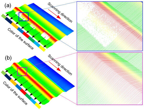 The measurement results obtained without and with adaptive control are shown in Figure 7. Without adaptive control, the problem of underexposure exists in the low-reflectivity area, resulting in the loss of measurement data points, as shown in Figure 7a. When the adaptive control is employed, the measured result exhibits better integrity, as shown in Figure 7b. This further validates the superiority of the adaptive control method.