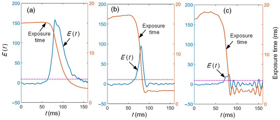 The proportional coefficient Kp has a significant influence on the control performance. The adaptive adjustment process of exposure time is analyzed when the surface color changes abruptly (dark blue to beige). When Kp = 0.2, the adjustment process is slow, as shown by Figure 8a. The exposure time cannot be tuned to the desired value in time, leading to an excessive deviation in quality parameters. It can also be seen that the fluctuation in the stripe quality has little influence on camera exposure time, resulting in a more stable exposure time. When Kp is increased to 1.0, the maximum deviation of E(t) is rapidly reduced to the stable region, as shown in Figure 8b. The overshoot is only 2.7% and can quickly reach a stable state. As Kp continues to increase, the maximum deviation decreases, yet not significantly, due to the oscillatory instability, as shown in Figure 8c.