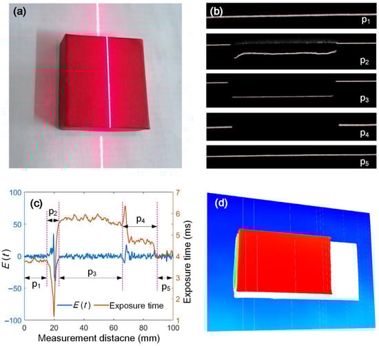 The adaptive controlled exposure time during the scanning process is shown in Figure 9c. When the laser plane does not intersect the surface, the system automatically adjusts the exposure time to a stable value of approximately 4 ms. When the laser stripe is projected onto the side of the object, the light intensity reflected into the camera increases dramatically since this surface faces the camera. The stripe quality parameter also increases. To keep the quality parameter within the desired range, the control system adjusts the deviation by reducing the exposure time. When the laser stripe moves onto the top surface, the exposure time automatically increases due to the darker color. When part of the stripe is blocked, the control system can still modulate the quality parameters of the laser stripe. Therefore, the adaptive control has been realized for the whole scanning. Figure 9d is the measurement result which further validates the effectiveness of the control method.
