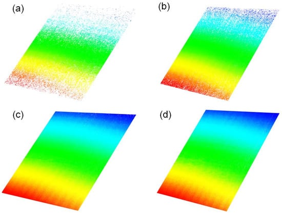 The scanning processes of the aforementioned surfaces are carried out with different exposure times. The point cloud data of the aluminum plane are shown in Figure 11. When the exposure time is 1 ms, dense points can be obtained only in the center region. Massive points are lost at the edge due to underexposure. As the exposure time increases, the underexposed part of the laser stripe gradually reaches the threshold value, enabling the extraction of the stripe’s center.