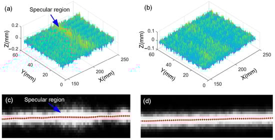 Measurement results and corresponding laser stripes: (a) aluminum plane, (b) ceramic plane, (c) laser stripe for aluminum plane, and (d) laser stripe for ceramic plane.