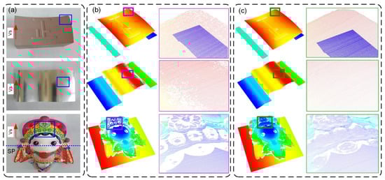 To further validate the feasibility of the method, experiments were carried out on complex surfaces with different materials. Figure 13a shows three parts to be measured. The first one is a hyperboloid surface, on which several characters were carved. It was made of polyurethane, which has excellent diffuse reflection characteristics. The second one is an aluminum part which has a precision milled freeform surface. The third one is a ceramic part with rich colors. For the polyurethane plane in Figure 10b, it is easy to obtain ideal measurement results. However, for the complex surface in Figure 13a, the angle between the normal surface and the camera’s optical axis varies greatly. When this angle is small, the light entering the camera is intense, and overexposure is likely to occur. Conversely, when the angle is too large, the light entering the camera is weak, resulting in underexposure. This causes the loss of measurement points, as shown in Figure 13b. After measuring the polyurethane plane, the optimal exposure time is selected and is then directly applied to measure the aluminum and ceramic surfaces. In this situation, a large number of missing points can be observed, indicating that the optimal exposure time is not the same for different materials. However, when the adaptive control method is employed, the system can automatically adjust the exposure time based on the shape, surface material, roughness, and color of the measured surface. The improvement can be seen in Figure 13c.