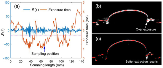When adaptive control is implemented, the exposure time can be adjusted during the same scanning process. This adjustment ensures that the deviation of stripe quality remains within the ideal range. The adaptive adjustment process of the stripe quality and camera exposure time over the entire measuring process is shown in Figure 6c. The camera’s exposure time increases in areas with low reflectivity and decreases at high-reflectivity regions. This ensures that E(t) is within an ideal range.