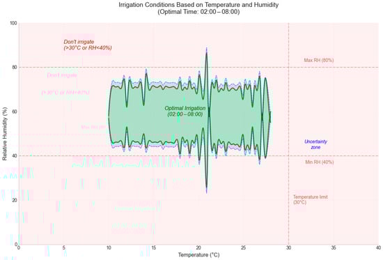 The decision results are plotted as follows: the red area indicates the decision not to irrigate, the green area suggests irrigation, and the blue area highlights an AI uncertainty interval. This uncertainty zone, being small in size, is considered insignificant and does not influence the final irrigation decision. These representations emphasize the robustness and accuracy of the model in making water resource management decisions.