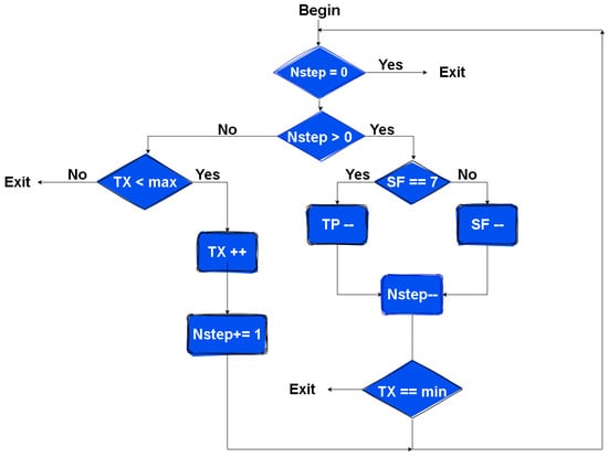 Equation (1), in the first phase of ADR execution, determines the number of steps performed in the algorithm, as illustrated in Figure 3. Thus, the gateway estimates the maximum SNR value () of the last N transmissions, while the value of varies between 5 and [34]. In our implementation of the algorithm, we set this to . The represents the SNR required for successful demodulation.