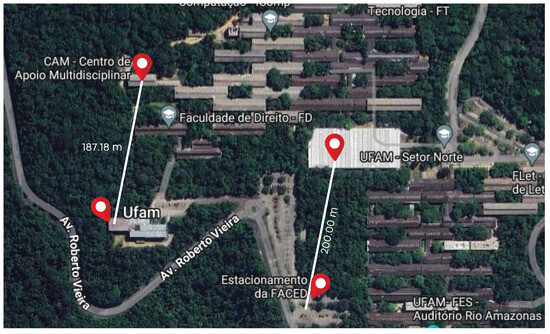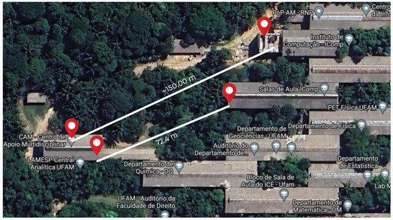 In the context of this project, it is relevant to highlight that the communication must include transmission across forested environments. Figure 13a illustrates an example of the line-of-sight communication used in this work’s experiments. The image was taken on the campus of the Federal University of Amazonas (UFAM), located in Manaus, Amazonas, Brazil (03º04′34′′ S, 59º57′30′′ W; datum = WGS84). Despite being situated on a university campus, this environment likewise illustrates the same conditions of real-world experiments in the Amazon rainforest. UFAM hosts one of the largest urban forest fragments of the planet, a 776 ha campus mainly composed of primary and secondary forest, as well as anthropic areas and water bodies, as illustrated in Figure 13b, taken from [38].