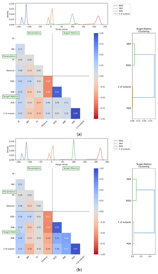 Correlation matrices illustrating the relationship between parameters and target metrics in the R-array characterization process. (a) Correlation matrix including the PT = 18 scenario; (b) correlation matrix excluding the PT = 18 scenario.