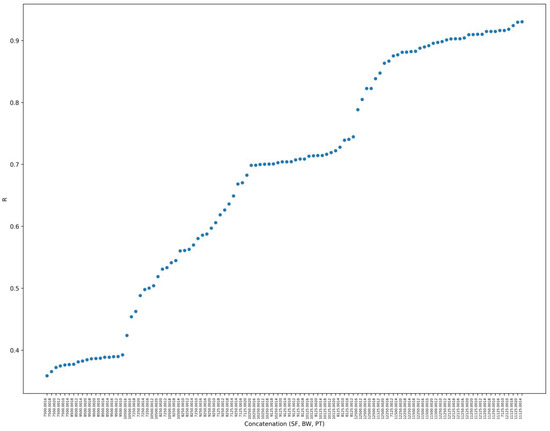 R values found in characterization experiments for each parameter combination. A very high resolution version of the R chart is available at: https://tede.ufam.edu.br/image/R_values_characterization.jpg, accessed on 15 December 2024).