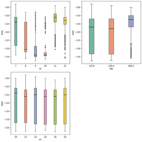 On the other hand, SF and BW are aligned with the expected performance observed in other LoRa studies. Applying a one-way ANOVA test, we confirmed that the null hypothesis can be rejected for the means observed, with a p-value = for the SF–PDR relationship and p-value = for the BW–PDR relationship.