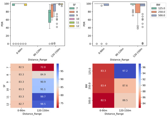This anomalous behavior was also observed in the correlation between distance and PDR, in relation to SF and BW values. As shown in Figure 8, the PDR was unexpectedly lower in almost all cases at a distance of 72 m. These results further support the positive correlation found between distance and PDR. Additionally, it was observed that deviations in PDR values increase at longer distances. This result is consistent with the RSSI deviation described in Figure 7, where the RSSI variation led to outliers found in the PDR results.