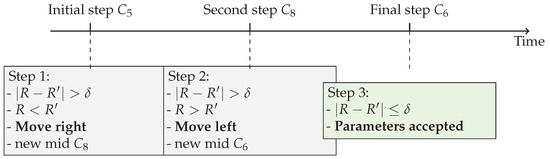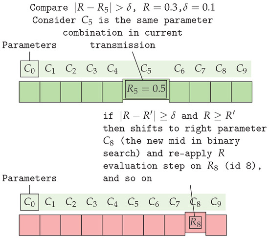Example of binary search algorithm proposed using R values in sorted R-array for the calculated , by comparing them in the green R-array using . In the red R-array, the old parameter combination () has shifted to the right side of the array to use the new parameter combination (, and comparing it to the newly calculated R, re-applying the R evaluation step using .