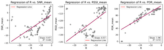 Linear regression analysis of R values compared to the means of SNR, RSSI, and PDR for each combination/distance during the characterization experiments, considering and .