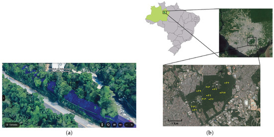 Illustrations about the scenarios used in this research on the campus of UFAM. (a) The view of line-of-sight transmission across the forest at UFAM campus. (b) UFAM campus, one of the world largest urban forests, in the middle of Manaus City [38].