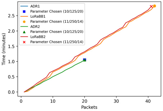 LoRaBB held an advantage by selecting specific parameters which resulted in a ToA, compared to the ADR result, 206.84 ms and 247.80 ms, respectively (results extracted with LoRa calc: https://www.semtech.com/design-support/lora-calculator, accessed on 1 July 2024). As stated by Križanović et al. [39], ToA is fully related to device energy consumption, where higher ToA implies more energy consumption by the transmitter device.