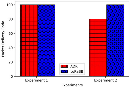 Further, analyzing packet delivery performance, as illustrated in Figure 16, the ADR had the worst performance on experiment 2, reaching 100% and 80% for each experiment scenario, while LoRaBB reached a 100% PDR in such cases. Even in a scenario of a relevant short distance for LoRa communication, ADR did not reach a 100% PDR.