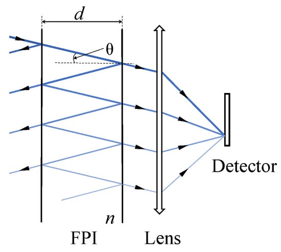 FPI comprises two semi-reflective mirrors, with an interval of d and a medium refractive index of n. Its schematic diagram is shown in Figure 1. A beam of parallel light with wave number is incident on the FPI with an angle . After multiple reflections and transmissions, the outgoing light angle remains unchanged. The OPD between adjacent outgoing light beams is , and the phase difference is .