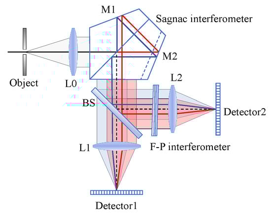 The schematic diagram of the SMJI-HI system based on FPI and TSMFTIS is shown in Figure 2. First, the object beam passes through the collimation system L0 and enters the LSI, and the outgoing beam is divided into two paths by the beam splitter. The LSI takes the Sagnac interferometer as an example. One beam passes through the imaging system L1 and converges on Detector1; the other beam passes through the FPI and then passes through the imaging system L2 and converges on Detector2. The imaging system and detector are the same in the two optical paths, and the only difference is whether there is FPI. On Detector1, the interferogram from the Sagnac interferometer can be obtained; on Detector2, the interferogram resulting from the joint interference of the Sagnac interferometer and the FPI can be obtained. The maximum OPD of the Sagnac interferometer determines the maximum OPD of these two interferograms. Subsequently, based on the designed algorithm, a new interferogram with double the OPD is calculated by combining the two interferograms, thereby achieving spectral super-resolution.