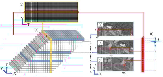 where and are the reflectivity and transmittance of the beam splitter of the Sagnac interferometer respectively, is the OPD produced by the Sagnac interferometer, D is the transverse shear amount, is the corresponding object point spectrum at the detector position, and f is the focal length of L1 and L2. Equation (3) describes the interference images collected by the Sagnac interferometer at a certain moment, corresponding to Figure 3a–c. Therefore, each column of pixels along the X direction on the image surface has a fixed and known OPD, forming longitudinal interference fringes, as shown in Figure 3a–c. The target scene is completely scanned across the image plane along the interference direction X by push scanning. Data are collected every time the scene moves one pixel. The interference signals at all pixels in the X direction for the same target point are obtained over the times ∼. All the collected interference images are then combined according to the target’s real-world spatial coordinates and time, as shown in Figure 3d. By extracting all the interference data along the T direction for the target point located at (X, Y), these data form the interferogram for that target point, as shown in Figure 3f. Through continuous scanning, the interferograms for all objects in the scene can be obtained. This is the working principle of TSMFTIS.