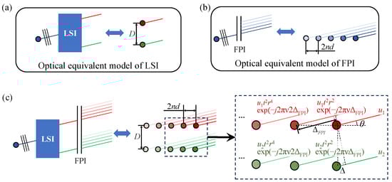 Due to the addition of FPI, another path must consider the lateral shear double-beam interference and multi-beam interference joint interference. As shown in Figure 4, the principle of the LSI can be equivalent to shearing the incident parallel light into two components. The lateral shearing amount is D. The working principle of FPI can be equivalent to generating countless components longitudinally from the incident parallel light. The energy decreases step by step, and the longitudinal interval is . Therefore, the joint interference of the two can be regarded as shearing into two components in the horizontal direction and forming countless components in the vertical direction.