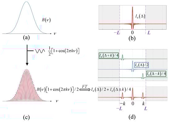 Assume the target spectrum is and its interferogram is , as shown in Figure 5a,b. The two are in an FT relationship with each other. The interferometer has a maximum OPD of L, and the interference information of outside L will be lost. If a cosine spectrum with frequency k modulates , that is, , as shown in Figure 5c,d, the interferogram of the modulated spectrum is as follows: