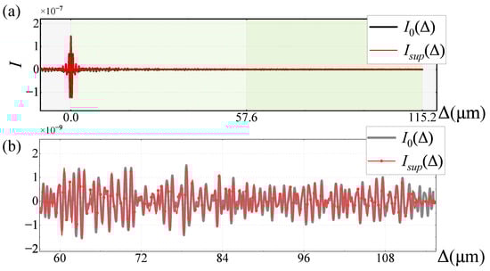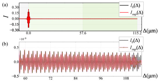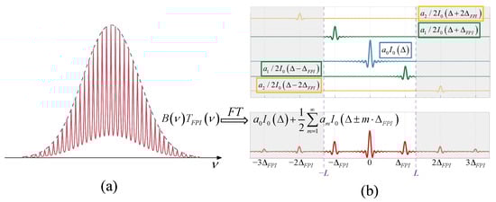 Thus, the joint interference spectrum and the interferogram can be obtained, as shown in Figure 6. In Figure 6b, can be considered as the superposition of the fundamental frequency component and the frequency shift component . Therefore, the complete interferogram will contain countless interference peaks gradually decaying at positions .