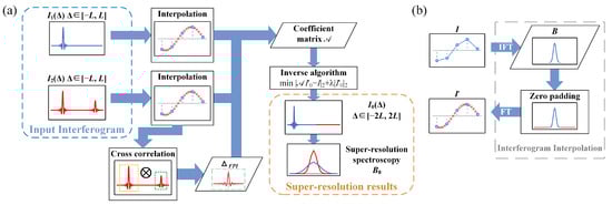 where , is the error term, is the regularization term to reduce ill-posedness and errors, and is the regularization coefficient used to balance the error term and the regularization term. The interferogram can be viewed as an oscillating curve around zero, so we chose the L2 norm of the entire interferogram as a regularization term to mitigate the ill-conditioned nature of the problem. The process of the spectral super-resolution algorithm is summarized in the Figure 7.