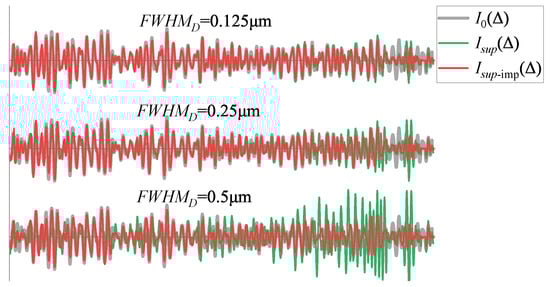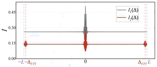 Using Gaussian functions as input spectra, the interferograms and obtained by Detector 1 and 2 are shown in Figure 9, which corresponds to the non-shaded areas in Figure 6b. In , interference peaks are only present at . In , interference peaks at indicate the introduction of interference shift components due to the FPI. is the same as described in Figure 6, with interference peaks at . Since is slightly smaller than L, these interference peaks exceed the maximum OPD range and are lost. The high-frequency interference information of these frequency-shifted components is superimposed onto within the range of . Since this additional high-frequency information is ignored in Equation (12) when establishing the linear equations, it becomes one of the main sources of calculation errors.