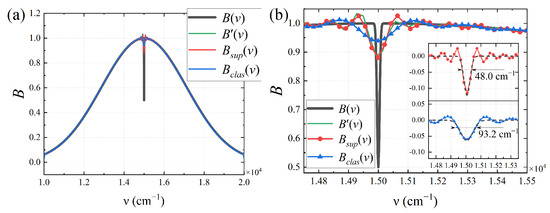 Using Gaussian functions with FWHM of 5000 and 10 to represent the low-frequency and high-frequency information of the spectrum, respectively, the super-resolution spectral results are shown in Figure 11. In the figure, is the input spectrum; the red curve is the super-resolution spectrum obtained based on the super-resolution interferogram; the blue curve is the classical TSMFTIS spectrum obtained from with ; and the green curve is the standard spectrum directly obtained from with . According to the restoration results, matches the Gaussian function with a width of 7500 . For the high-frequency information represented by the Gaussian function with a width of 10 , it can be seen that has sharper peaks and is essentially consistent with . The FWHM results obtained from the Gaussian fitting of the spectra are shown in Figure 11b; the FWHM of is 93.2 , and the FWHM of is 48.0 . This demonstrates that the spectral resolution has been improved by nearly twofold.