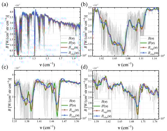 Considering both types of optical defects, assuming the FWHM of in Equation (19) is 0.125, 0.25, and 0.5 m, respectively, where the broadening due to non-parallelism and non-flatness each contributes 50%, the interferogram reconstruction is performed using both the improved and the unimproved algorithm from Section 3.3. The results shown as the red curve and the green curve in Figure 16. It can be seen that when the FWH is small, the results using the improved and unimproved algorithms are relatively close. As the FWH increases, the error in increases, while the result of changes less and remains more accurate. As shown in Table 3, under the unimproved inversion algorithm, both and decrease significantly as the increases. It’s evident that the improved algorithm consistently delivers smaller errors. Therefore, the improved algorithm is feasible and effective. Moreover, the of the unimproved inversion algorithm increases as the error increases. This is because, as can be seen from Figure 13, exhibits a large number of absorption peaks; the increase in error causes the super-resolved spectrum produced by the unimproved inversion algorithm to oscillate, thereby making its structure more similar to that of .