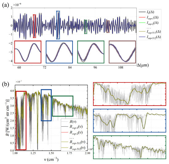 Using the Gaussian function as the input spectra, the restored super-resolution interferogram is compared with over the range , as shown in Figure 10. The results show that the high-frequency components of the interferogram are generally well restored. The main source of error at the is the OPD positions near in , where the computational error arises from separating the smaller amplitude from the larger amplitude . It is necessary to add a regularization term to constrain the amplitude at this position. Consequently, the error at is relatively smaller.