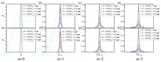 Based on and , a simulation analysis of the FT of the FPI spectral transmittance under these two optical defect conditions is shown in Figure 15. The simulation analyzed the cases where the FWH and FWH are 0, 0.05, 0.10, and 0.20 m, respectively. When the optical defects of the FPI are zero, its interferogram is consistent with Equation (11), with each frequency shift component being a function. When there is non-parallelism and non-flatness, the fundamental frequency component does not broaden, while frequency shift components convolve and broaden with and . Moreover, as the order m increases, the broadening of the frequency shift components increases m-fold, and their height decreases to . As the optical defects increase, their broadening becomes wider. The simulation results are consistent with the analysis in Section 3.3.