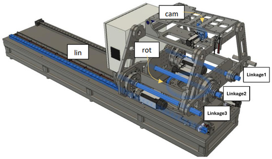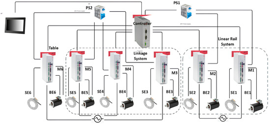 - Each subsystem is controlled by a dedicated servo motor (M1–M6), with feedback from both primary (PE1–PE6) and secondary encoders (SE1–SE6).