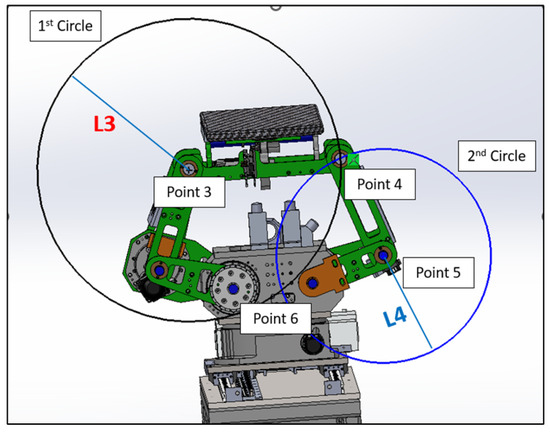 In the domain of kinematics and mechanical geometry, a well-accepted technique for determining the location of a specific point within a linkage mechanism involves the intersection of two circles [25]. As shown in Figure 11, we can pinpoint the position of Point 4 using this intersecting circles methodology. The scenario involves two circles: the first centered at Point 3 with a radius of L3, and the second centered at Point 5 with a radius of L5. The intersection of these two circles yields two potential points, namely Point 4 and Point 6.