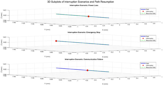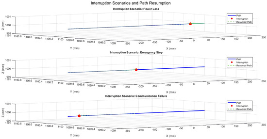 Figure 18 illustrates the PPS’s response during X-axis motion with the Y and Z positions fixed at 1100 mm and 1000 mm, respectively. The interruptions—a power loss at 20% of the trajectory, emergency stop at 50%, and communication failure at 80%—temporarily disrupted the motion. However, the system promptly resumed its planned trajectory after each interruption, maintaining sub-millimeter positional accuracy.