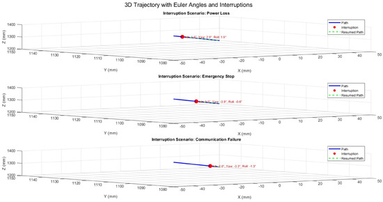 Three-dimensional trajectory illustrating interruption scenarios with Euler angles (Pitch, Yaw, Roll).