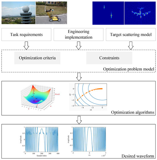 Radar waveform design can be concepualized as the formulation and solution of an optimization problem, as shown in Figure 2. Based on task requirements, target scattering models and engineering implementation, appropriate optimization criteria and constraints are determined, followed by utilization of optimization algorithms to generate the desired waveform.